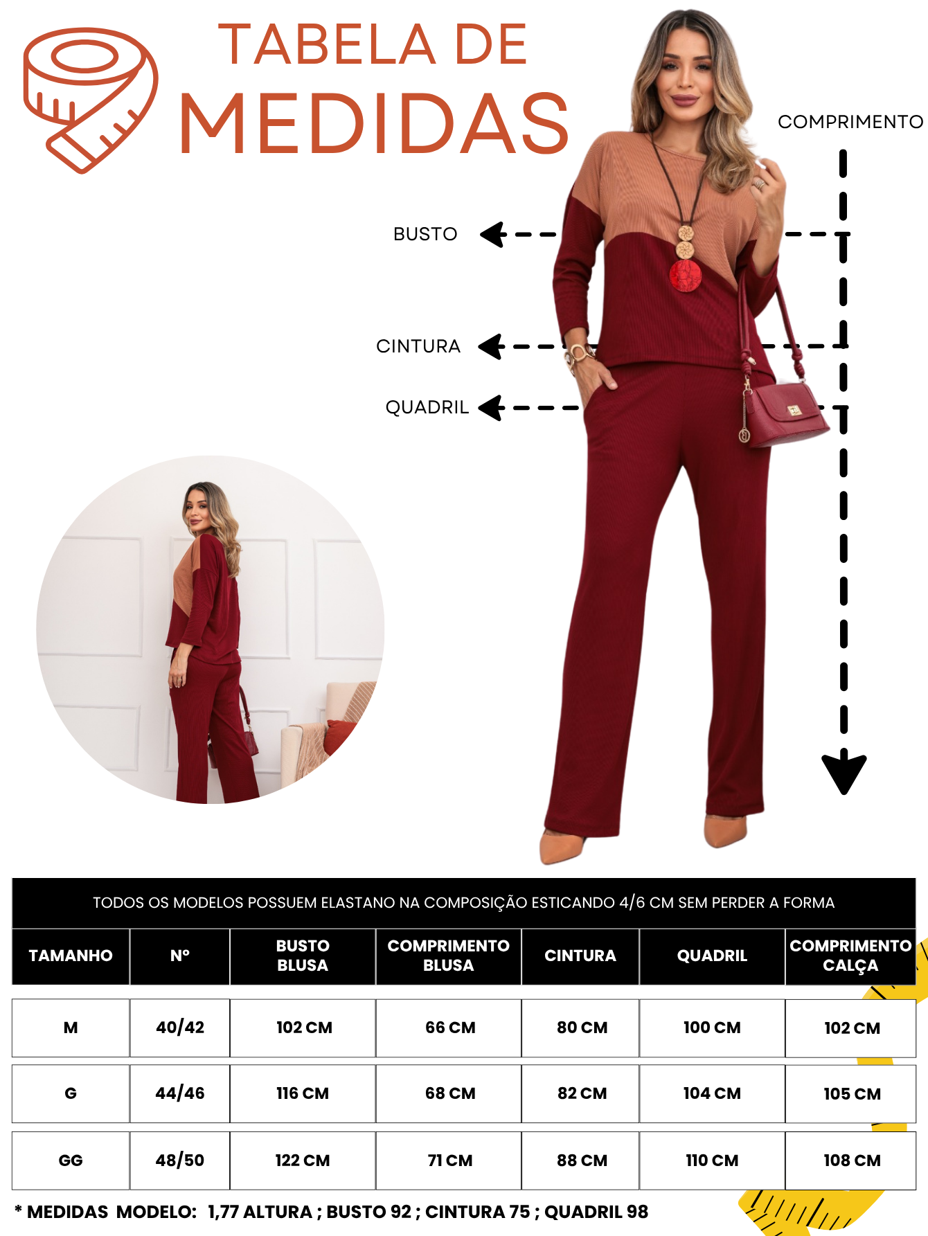 Conjunto feminino em malha premium canelada, com toque macio e caimento impecável que valoriza o corpo. Blusa de manga longa com design moderno em blocos de cor, trazendo elegância ao look. Calça confortável e versátil, perfeita para o dia a dia com muito estilo.