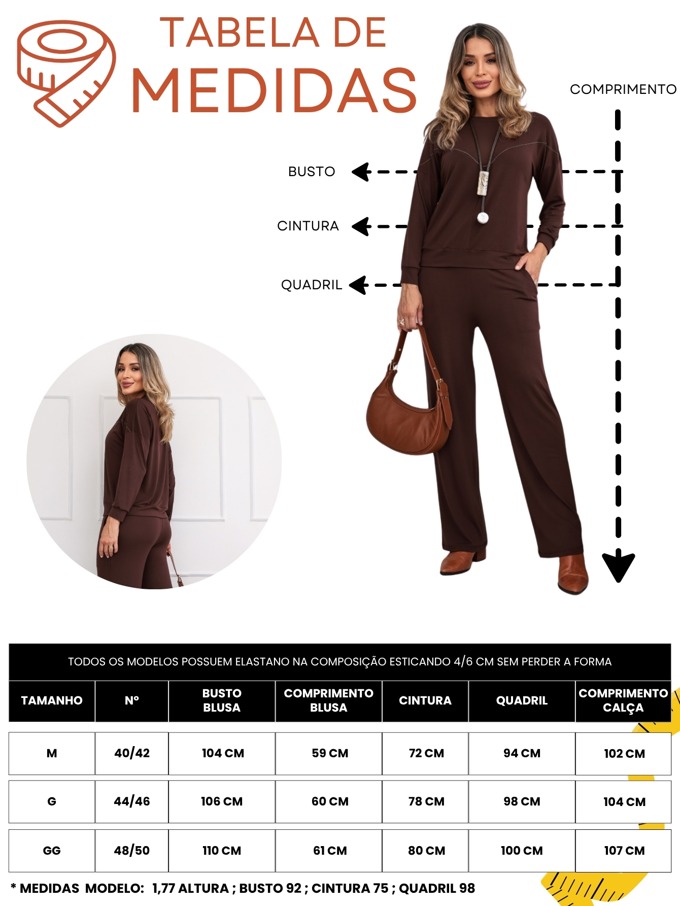 Características: - Conjunto em viscolycra (96% viscose, 4% elastano) - Blusa manga longa com punho e detalhe pespontado - Calça reta com corte clássico - Tecido leve, confortável e com excelente elasticidade - Versátil para diversas ocasiões