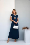 Esse belo vestido feminino longo é confeccionado em tecido leve e fluido, com modelagem que valoriza o corpo sem abrir mão do conforto. Possui gola V, manga curta com detalhe de faixa e uma fenda na parte de trás, que garante liberdade de movimento e um toque moderno. Ideal para o dia a dia, passeios ou momentos casuais com muito charme.