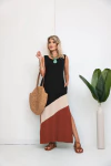 Novidade Primavera Verão Vestido feminino longo estilo 3 Marias, sem mangas, confeccionado em tecido leve e fluido. Possui bolsos laterais, camadas que dão movimento ao look e uma abertura lateral que adiciona um toque moderno e sensual. Ideal para ocasiões casuais e elegantes.