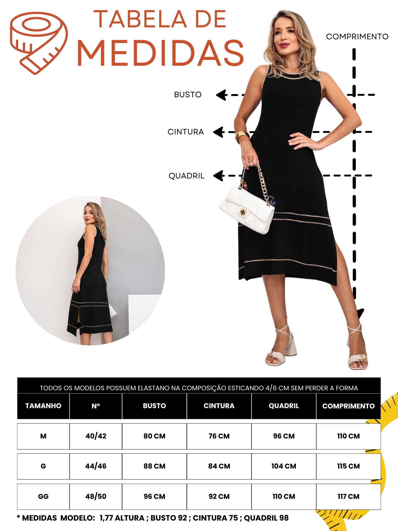 Vestido midi sem mangas, com modelagem levemente evasê que proporciona caimento fluido e elegante. Possui decote arredondado com detalhe duplo que valoriza o colo e traz um toque refinado ao visual. A barra apresenta detalhes em vivo que criam um efeito moderno e alongam a silhueta. Confeccionado em tecido leve e confortável, é ideal para compor produções sofisticadas e versáteis, perfeitas para o dia ou para a noite.